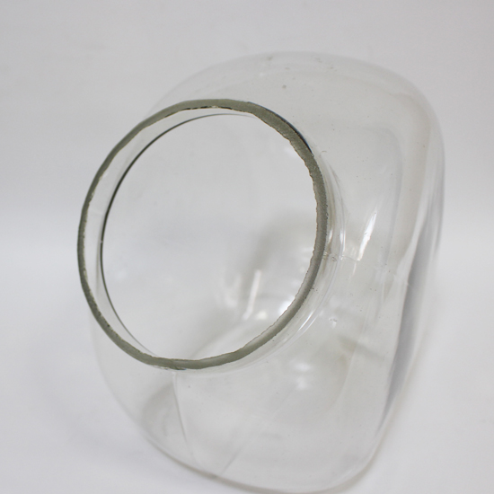 大正から昭和にかけて使用されていた陳列用蓋付ガラス瓶。昔駄菓子屋さんで見かけたかわいい丸っこい瓶です。気泡が入ったガラスが素朴な味わい。稚拙な作りで口周りが少々ギザっていますが、これもご愛嬌です。